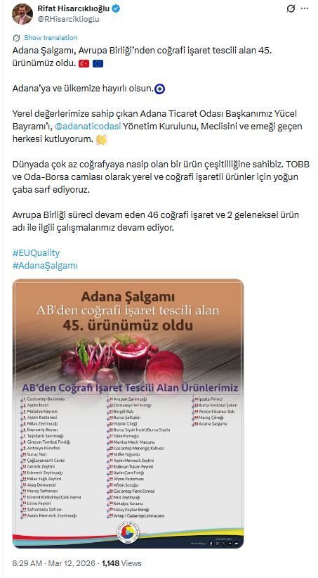 Adana Ticaret Odası’nın 2024 yılında Adana şalgamı için yaptığı coğrafi işaret başvurusu sonuçlandı. AB'de yürütülen inceleme sürecinin ardından Adana şalgamının tescil süreci onaylandı. Türkiye Odalar ve Borsalar Birliği (TOBB) Başkanı Rifat Hisarcıklıoğlu, Adana şalgamının Avrupa Birliği’nden coğrafi işaret tescili alan 45’inci ürün olduğunu bildirdi. Hisarcıklıoğlu, sanal medya hesabından yaptığı paylaşımda "Adana’ya ve ülkemize hayırlı olsun. Yerel değerlerimize sahip çıkan Adana Ticaret Odası Başkanımız Yücel Bayram’ı, yönetim kurulunu, meclisini ve emeği geçen herkesi kutluyorum. Dünyada çok az coğrafyaya nasip olan bir ürün çeşitliliğine sahibiz. TOBB ve oda-borsa camiası olarak yerel ve coğrafi işaretli ürünler için yoğun çaba sarf ediyoruz. AB süreci devam eden 46 coğrafi işaret ve 2 geleneksel ürün adıyla ilgili çalışmalarımız sürüyor” ifadelerine yer verdi.