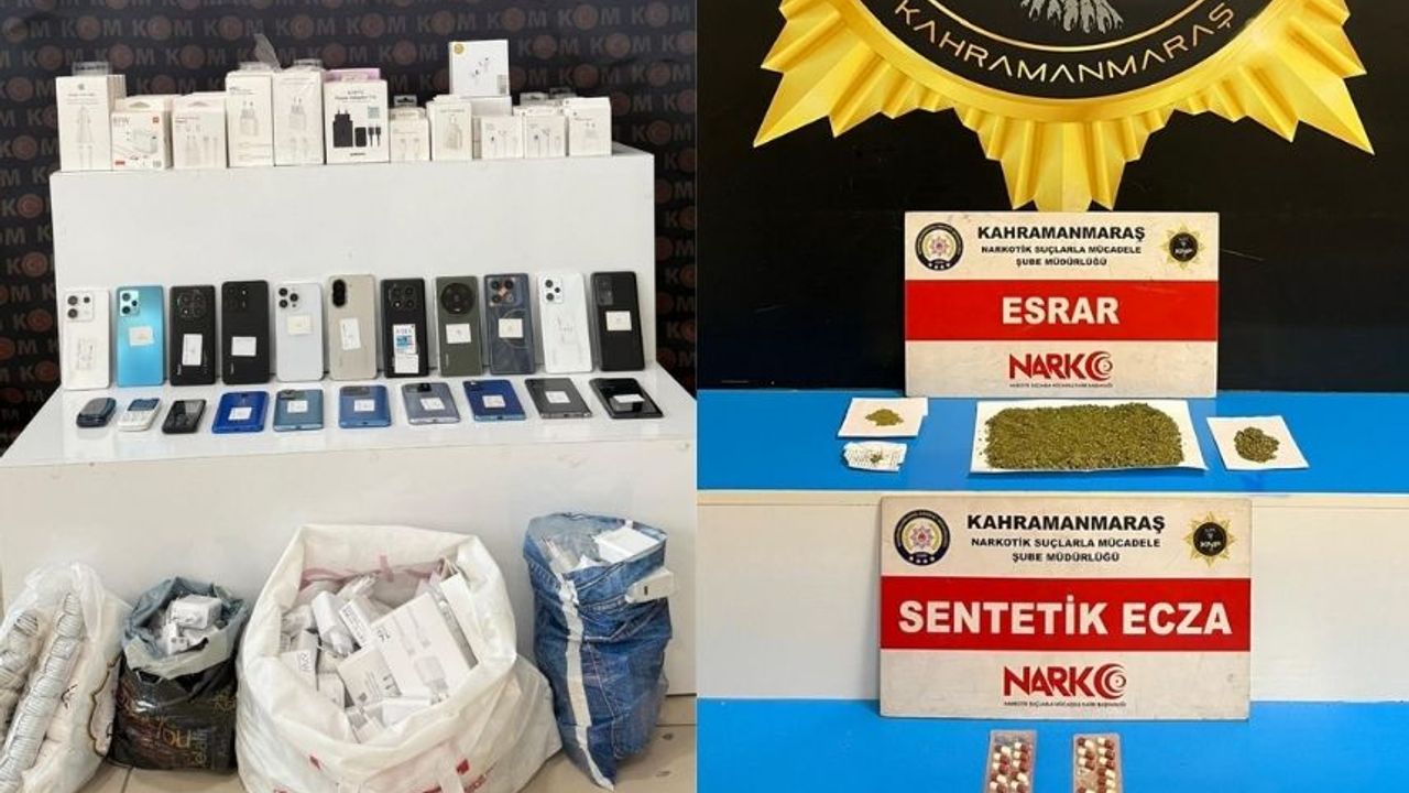 Kahramanmaraş Emniyet Müdürlüğü ekiplerinin suç ve suçlularla mücadelesi aralıksız sürüyor. Elbistan Kaçakçılık ve Organize Suçlarla Mücadele (KOM) Büro Amirliği tarafından Elbistan ilçesinde gerçekleştirilen çalışmada 21 adet cep telefonu ile 241 adet cep telefonu aksesuarı ve çeşitli emtia ele geçirildi. Kaçak olduğu değerlendirilen ürünlere el konulurken, olayla ilgili inceleme başlatıldı. Öte yandan, Narkotik Suçlarla Mücadele Şube Müdürlüğü ekiplerince yapılan operasyonda ise 78,57 gram esrar maddesi ile 22 adet sentetik ecza hap ele geçirildi.