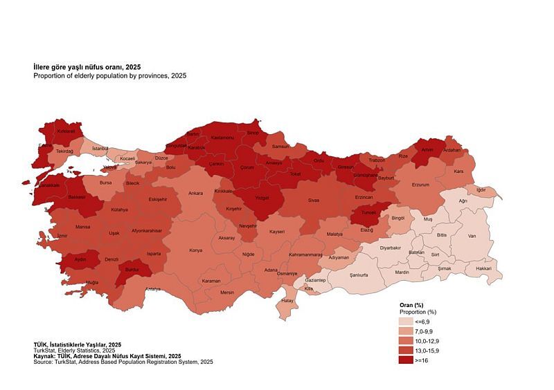 Kentte 65 yaş ve üzeri erkek sayısı 54 bin 664, kadın sayısı ise 59 bin 772 oldu. Yaşlı nüfus içinde kadınların daha fazla olduğu görülürken, yaşlı cinsiyet oranı 91,5 olarak açıklandı.