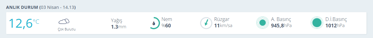 Meteorolojik verilere göre şehirde nem oranı yüzde 60 seviyelerinde seyrederken, rüzgarın saatte 11 kilometre hızla estiği bildirildi. Gün içerisinde kaydedilen 1,3 mm’lik yağış, ilerleyen saatlerde daha da artabilir.
