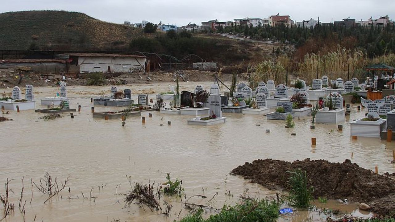 Yaşanan taşkın sonucu kanala yakın Buruk Mezarlığı'ndaki onlarca mezar sular altında kaldı.