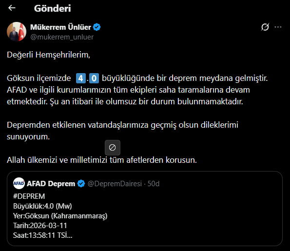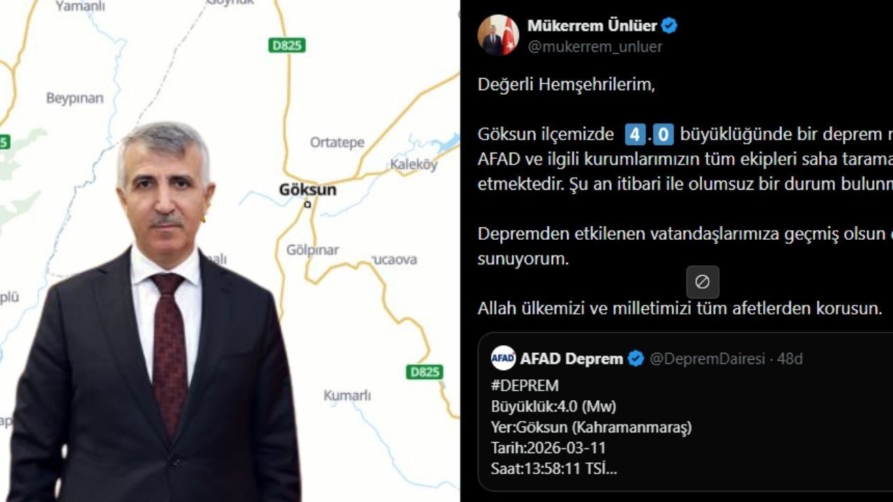 Kahramanmaraş’ın Göksun ilçesinde meydana gelen 4 büyüklüğündeki deprem kısa süreli paniğe neden oldu. Kahramanmaraş Valisi Mükerrem Ünlüer, sosyal medya hesabından yaptığı açıklamada depremin ardından saha tarama çalışmalarının başlatıldığı ve şu ana kadar herhangi bir olumsuz durumun tespit edilmediği bildirdi.